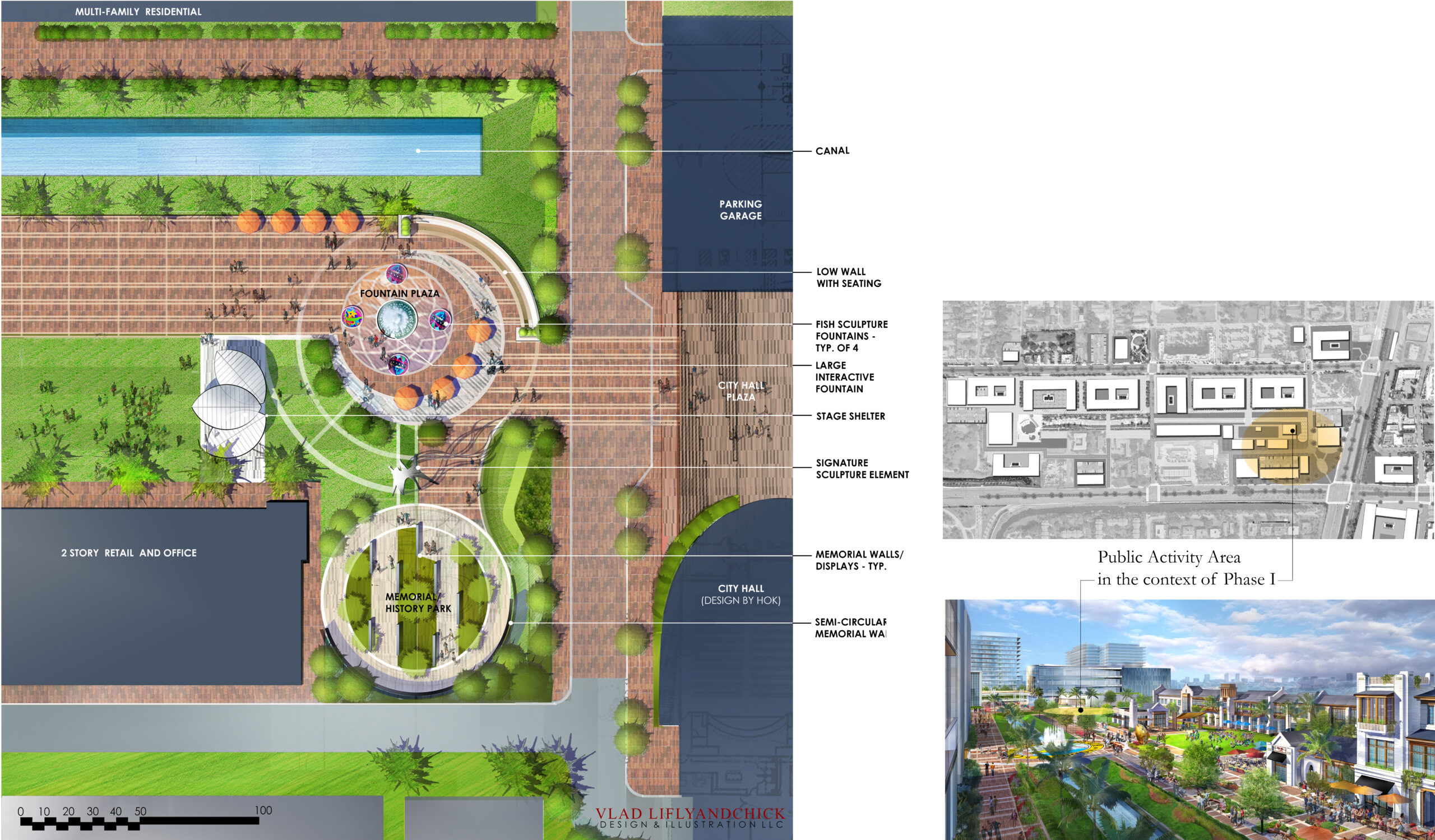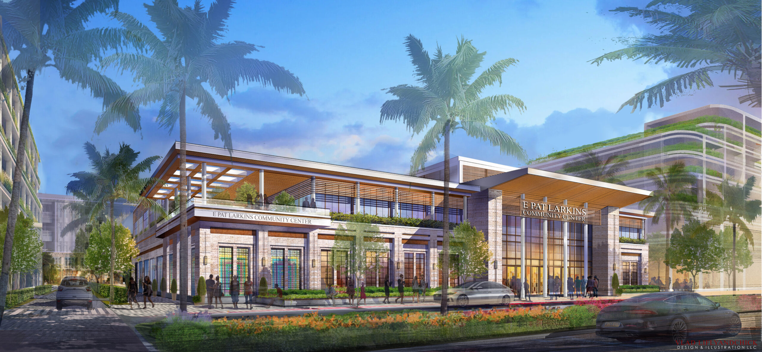Phase I is anchored by two civic landmarks: the new City Hall and the reimagined E. Pat Larkins Community Center—both conceived as catalysts and cultural cornerstones for the broader development.