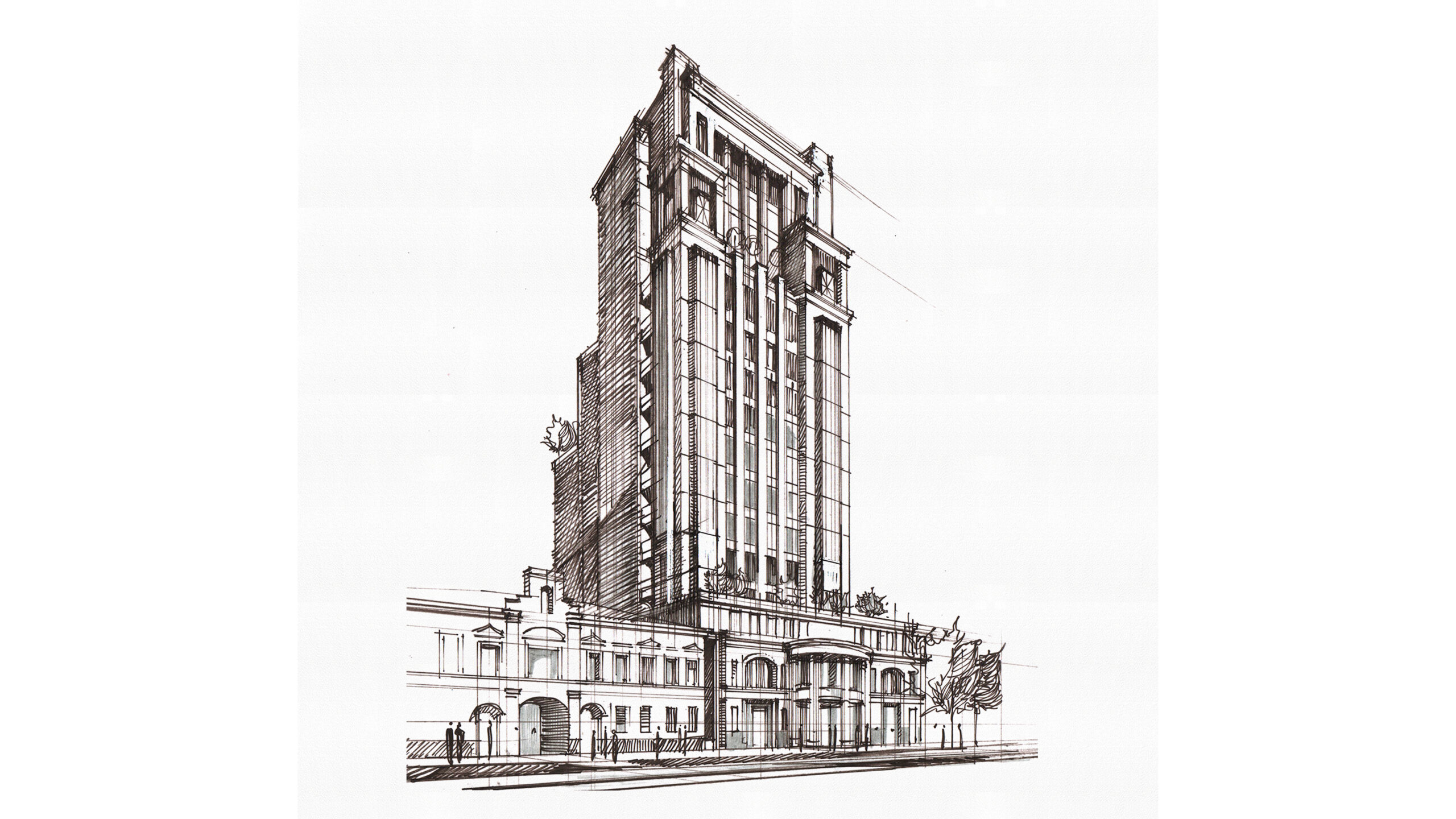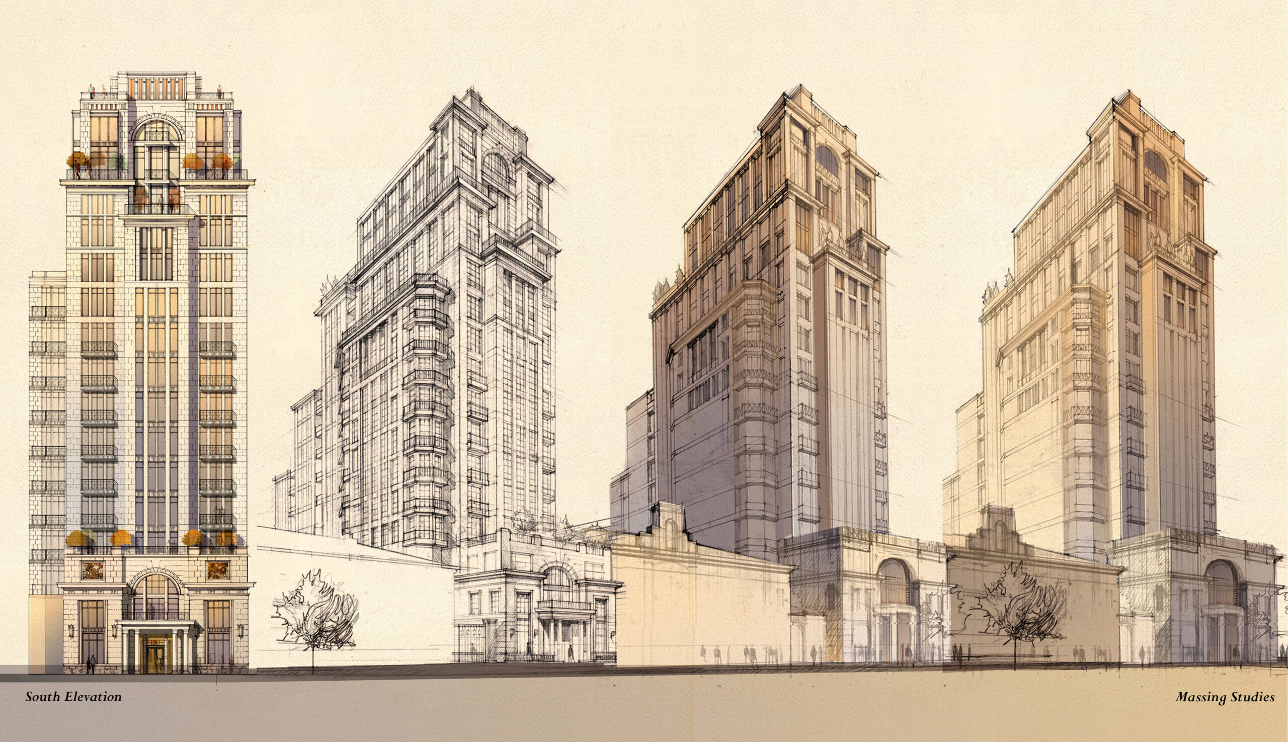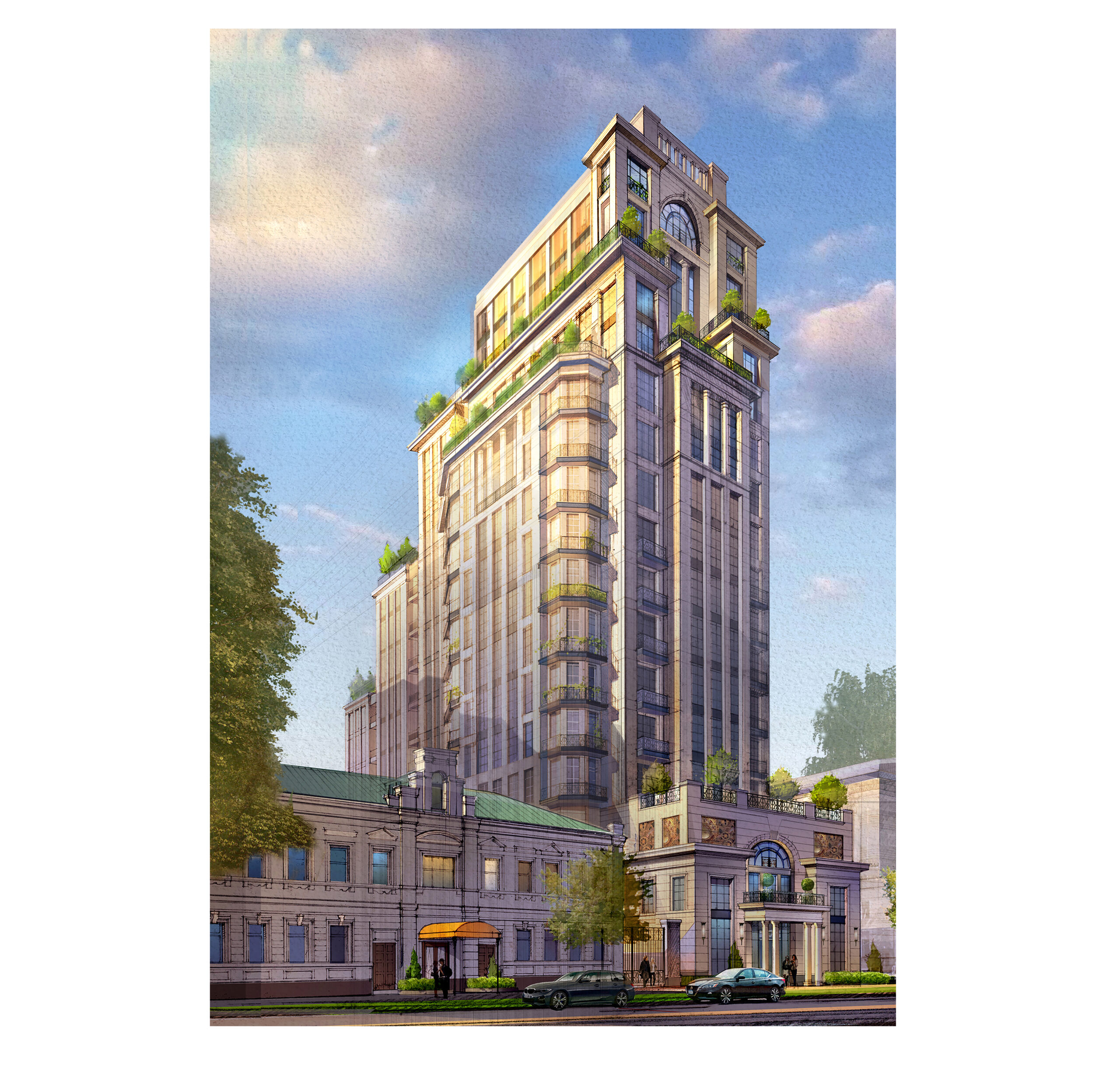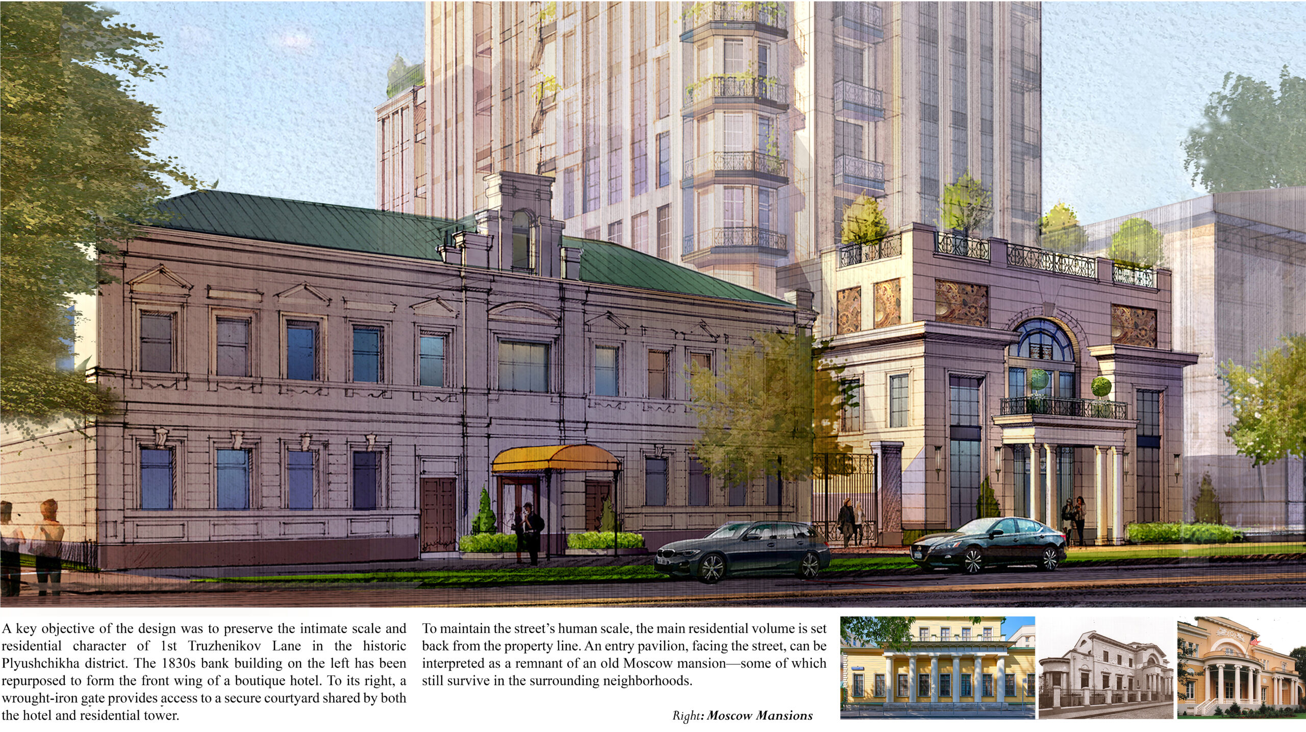 This project, a 16-story residential tower located in one of Moscow’s most prestigious historic neighborhoods, was developed as an invited competition entry. The program includes 60 luxury residences, underground parking, a private landscaped courtyard, and a boutique hotel housed within an adjacent restored 1830s bank building.